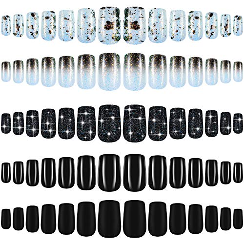 120 Pieces 5 Sets Medium Square Press on Nails Matte Ballerina False Nails Solid Color Fake Nails Glitter Artificial Coffin Nails Tips Full Cover False Nails for Salon Home Nail Art DIY