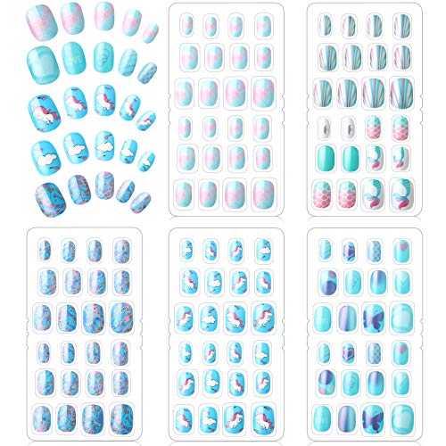 120 Pieces Kids Press on Nails Children Fake Nails Artificial Nail Tips Girls Full Cover Short False Fingernails for Girls Kids Nail Art Decoration (Blue Color)