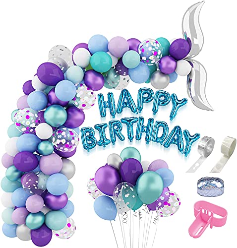 144Pcs Mermaid Tail Balloons Arch Garland Kit, Green Purple Metallic Confetti Pink Blue Latex Balloons for Mermaid Theme Birthday Party Supplies Under the Sea Party Decorations with 4Pcs Balloon Tools