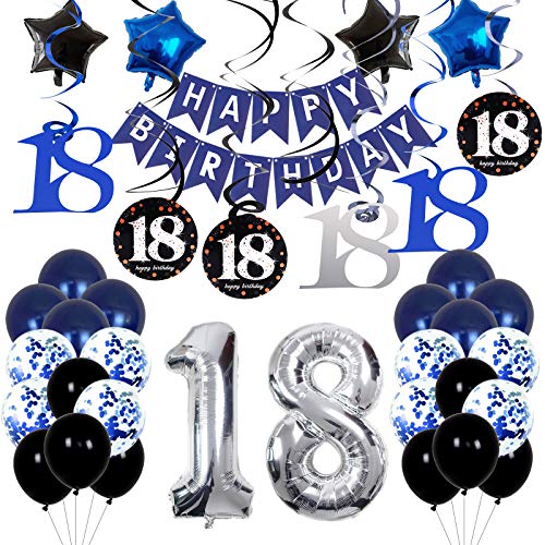 18th Birthday Decorations Navy Blue for Boys Mens Girls, Party Decorations with Swirl Decoration 18th Happy Birthday Banner and Star Foil Balloons Confetii Latex Blue Balloons for Party Supplies