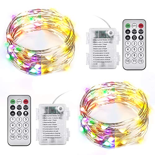 2 Packs Fairy Lights Battery Powered, 5M 50 Led Silver Wire Warm White & Multi-Colour Battery Operated Twinkle String Lights with Timer Remote Control for Outdoor, Christmas, Wedding, Indoor, Bedroom