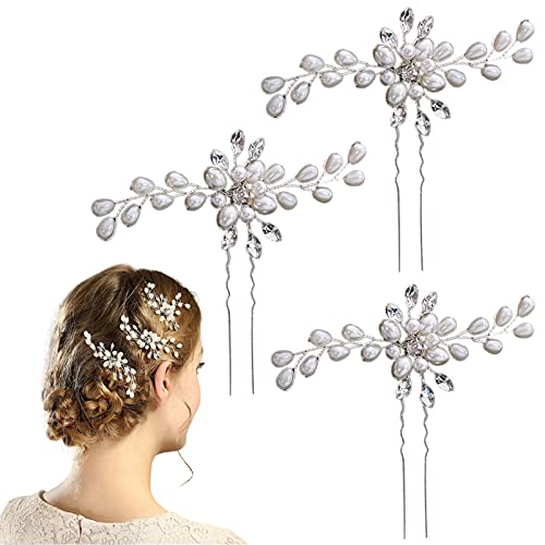 3 PCS Bridal Hair Pins, SONGQEE Pearl Flower Crystal Bridal Bridesmaid Jewelry Wedding Hair Pin Clips Rhinestone Headpiece Accessories Bobby Pin