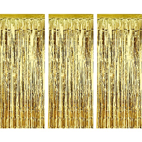 3 Pack Metallic Tinsel Curtains, Foil Fringe Shimmer Curtain Door Window Decoration for Birthday Wedding Party (Gold)