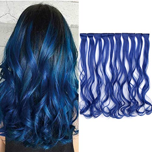 10Pcs Colored Clip in Hair Extensions 20 Inch Colorful Hair Extension for Girls Women Kids Rainbow Multi-Colors Party Highlights Synthetic Hairpieces Long Wavy Curly - Dark Blue
