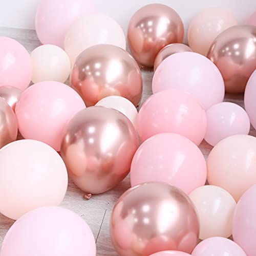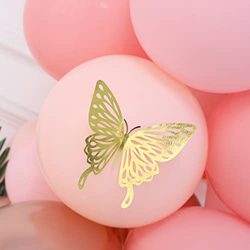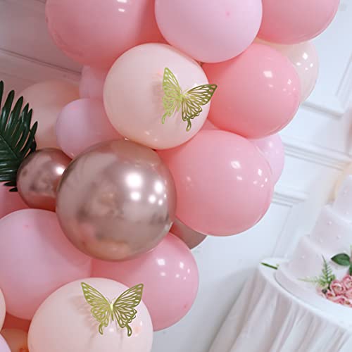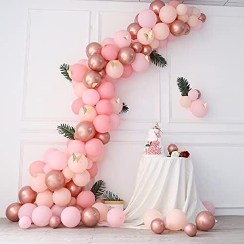 - 186pcsballoon arch garland kit: You will get everything used to make a balloon arch! Including: Macaron orange balloons 10 inches * 20, 5 inches * 25, Pastel pink balloons 10 inches * 30, 5 inches * 30, 12 inches * 5, metal rose gold balloons 5 inches * 30,10 Inch*30, butterfly stickers*12, points stickers*1, Balloon chain*1, Ribbon*1, knotted Tools*1.