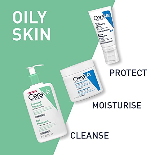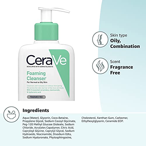 Details: Product Description Developed with dermatologists, the foaming gel formula of the CeraVe Foaming Cleanser gently cleanses the skin to remove excess makeup and oil while protecting the skin barrier with three essential ceramides and MVE technology to provide instant and long lasting hydration. Hyaluronic Acid helps to retain the skin’s natural moisture. Indications Normal to oily skin. Ingredients AQUA / WATER, COCAMIDOPROPYL HYDROXYSULTAINE, SODIUM LAUROYL SARCOSINATE, PROPANEDIOL, PEG-150 PENTAERYTHRITYL TETRASTEARATE, PEG-6 CAPRYLIC/ CAPRIC GLYCERIDES, GLYCERIN, CERAMIDE NP, CERAMIDE AP, CERAMIDE EOP, CARBOMER, NIACINAMIDE, SODIUM METHYL COCOYL TAURATE, SODIUM BENZOATE, SODIUM CHLORIDE, SODIUM LAUROYL LACTYLATE, SODIUM HYALURONATE, CHOLESTEROL, PHENOXYETHANOL, DISODIUM EDTA, CITRIC ACID, TETRASODIUM EDTA, PHYTOSPHINGOSINE, XANTHAN GUM, ETHYLHEXYLGLYCERIN Directions Apply to wet hands and massage into the skin, then rinse thoroughly Safety Warning Consult packaging