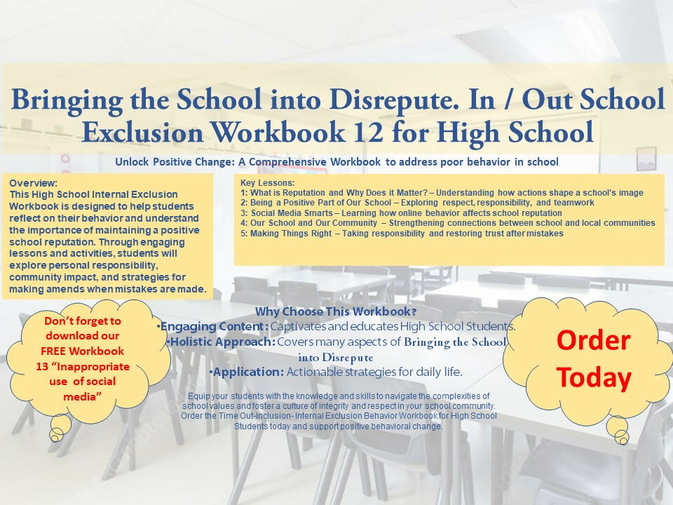 This High School Internal Exclusion Workbook is designed to help students reflect on their behavior and understand the importance of maintaining a positive school reputation. Through engaging lessons and activities, students will explore personal responsibility, community impact, and strategies for making amends when mistakes are made.