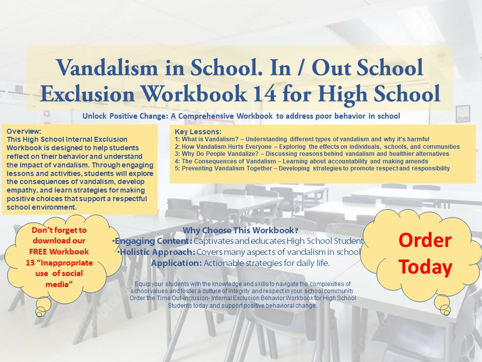 This High School Internal Exclusion Workbook is designed to help students reflect on their behavior and understand the impact of vandalism. Through engaging lessons and activities, students will explore the consequences of vandalism, develop empathy, and learn strategies for making positive choices that support a respectful school environment.