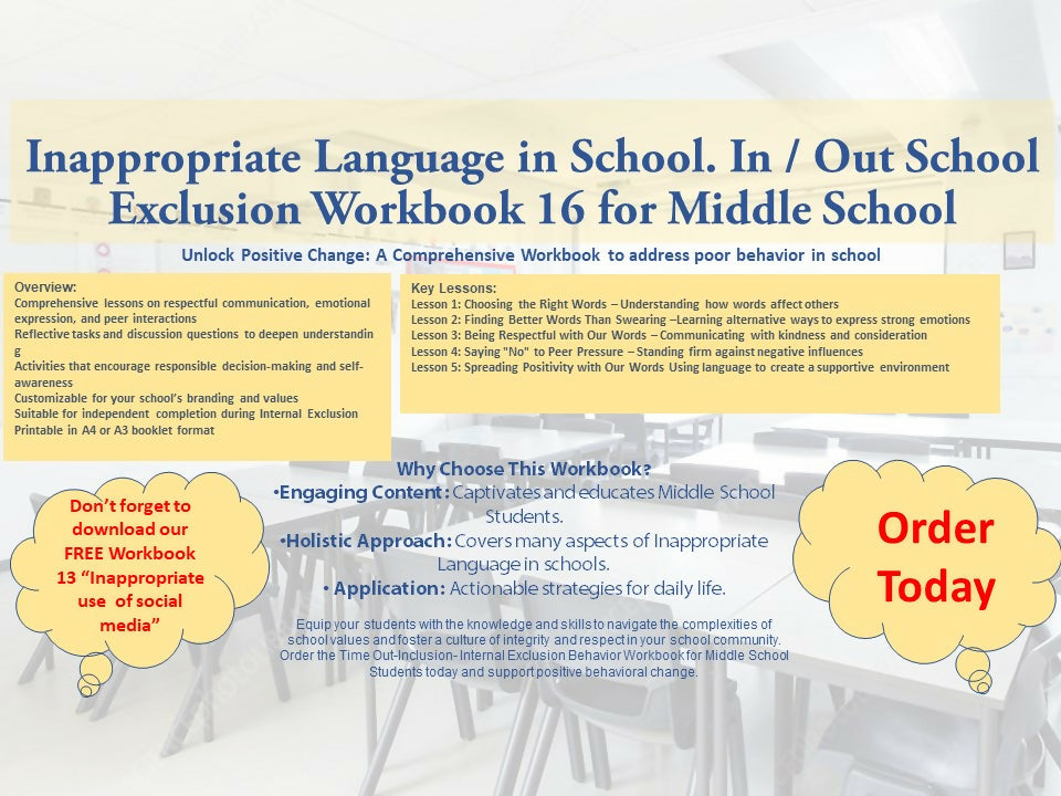 This Middle School Internal Exclusion Workbook is designed to help students reflect on their language choices and understand the impact of words. Through engaging lessons and activities, students will explore the power of language, develop strategies for respectful communication, and learn how to express emotions in a positive way.