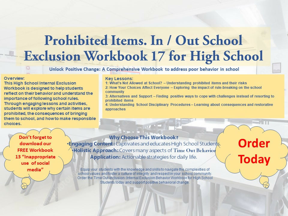 This High School Internal Exclusion Workbook is designed to help students reflect on their behavior and understand the importance of following school rules. Through engaging lessons and activities, students will explore why certain items are prohibited, the consequences of bringing them to school, and how to make responsible choices.