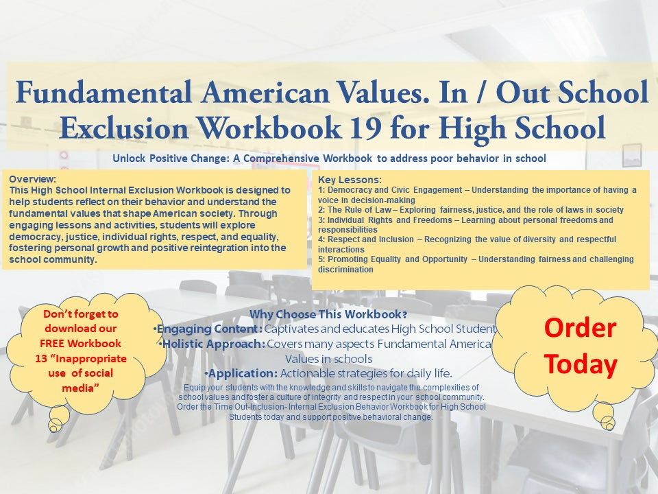 This High School Internal Exclusion Workbook is designed to help students reflect on their behavior and understand the fundamental values that shape American society. Through engaging lessons and activities, students will explore democracy, justice, individual rights, respect, and equality, fostering personal growth and positive reintegration into the school community.