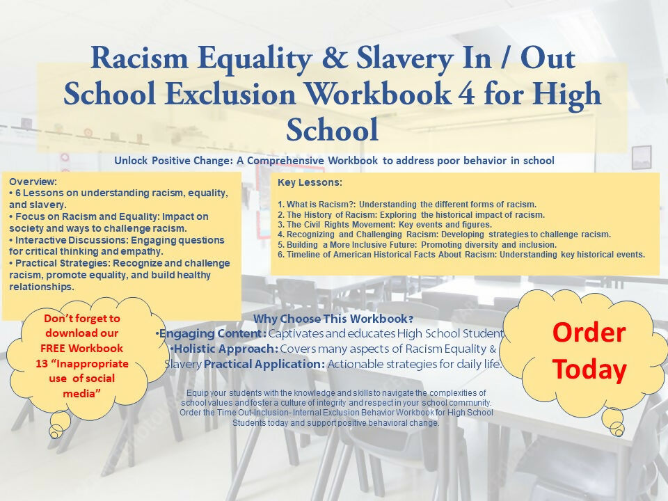 This High School Internal Exclusion Workbook is designed to help students reflect on their behavior and understand the importance of respecting differences. Through engaging lessons and activities, students will explore racism, equality, and slavery, fostering personal growth and positive reintegration into the school community.