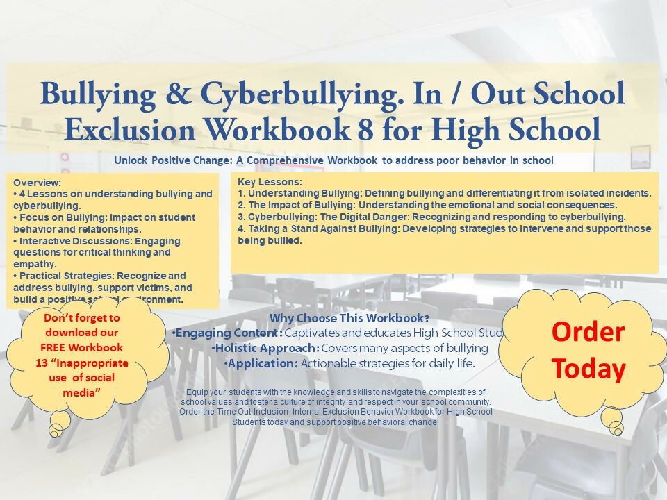 This High School Internal Exclusion Workbook is designed to help students reflect on their behavior and understand the impact of bullying and cyberbullying. Through engaging lessons and activities, students will explore empathy, consequences, and alternative strategies to foster a more inclusive and respectful school community.