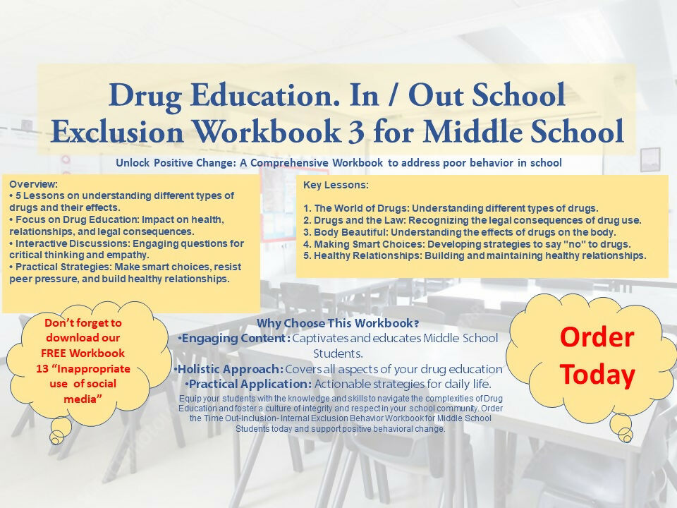 This Middle School Internal Exclusion Workbook helps students understand the risks associated with drug use and the importance of making informed, responsible choices. Through engaging lessons and activities, students explore the impact of drugs on health, relationships, and their future while developing resilience and strategies to resist peer pressure.