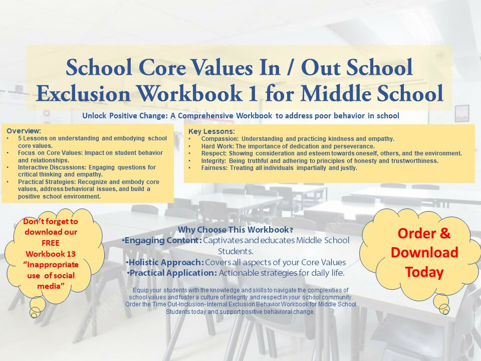 This Middle School Internal Exclusion Workbook is designed to help students reflect on their behavior and understand the importance of school values. Through engaging lessons and activities, students will explore Compassion, Hard Work, Respect, Integrity, and Fairness, fostering personal growth and positive reintegration into the school community.