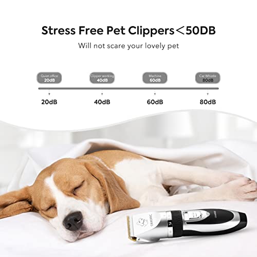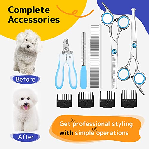 - 【Complete Pet Grooming Kit】: There are various accessories for you to make diverse hairstyles for any pets, which includes: 1 x Electric clipper, 4 x Limited Combs, 1 x Nail Clipper, 1 x Nail File, 1 x Round-head Scissors, 1 x Thinning Shear, 1 x Stainless Steel Comb, 1 x Cleaning Brush, 1 x Charger.
