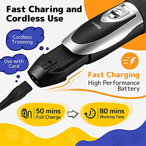 - 【Cordless Trimming & Fast Charging】: With built-in lithium battery of 600mAh of high performance, this pet clipper can constantly work for 70-80 mins which is long enough for you to do a complete haircut for pets of any size, and it can also be quickly and fully charged within 50 mins via an attached original charger.