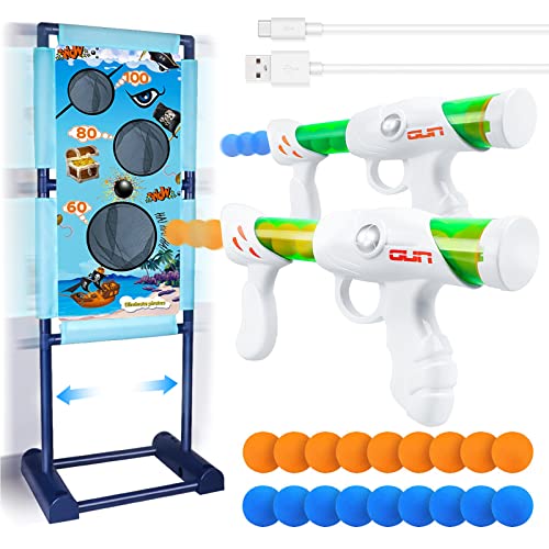 - [The Most Amazing Shooting Target in 2020] DX DA XIN kids shooting toy includes a pirate-themed moving target(110 x 42cm), 2 power popper guns, 18 pcs soft foam balls in blue and orange. You can play alone or share it with family or friends.