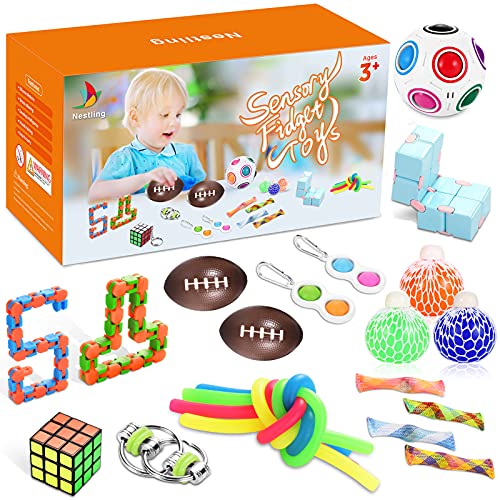 Details: Product description Fidget sensory toys help relieve stress, calm nerves, and increase the attention of children and adults, especially those with ADHD, ADHD, ADHD and autism.Very suitable for parties, festivals, classrooms or office toys. These toys will keep you alert and focused throughout the day and help develop new ideas. It is very suitable for students who cannot sit still. Animal soft glutinous rice squeeze toy set: very soft. Because of how great they feel and their squeezing ability, you won't be able to stop pinching them.Elastic Strings Set: Stretch, pull, rotate, wrap and squeeze them, and then watch them bounce to their original shape. These toys are very suitable for sensory and tactile stimulation.[Mesh and marble sensory toy set] Squeeze or slide the marbles back and forth, bend, fold, and squeeze the sleeves together, rolling the marbles like a rattle.Infinity cube set: The foldable Infinity cube consists of 8 small cubes. Each cube can be rotated from any direction and angle. Hold it with one hand and shape it into any shape you like.Decompression Cube Set: This decompression cube has 6 sides for you to rub, roll, rotate, press, control and switch; it is a compression cube. Safety Warning CHOKING HAZARD -- Small parts. Not for children under 3 yrs.