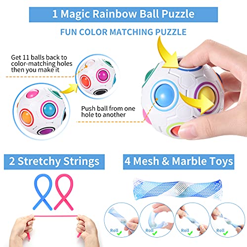 - 【PACK OF 22】: This complete sensory toy has 22 pieces, including: 1*Finger Pressure Relief Toy, 1*Magic Rainbow Puzzle Ball, 2*Simple Dimple Fidget Toy, 2*American foam football, 4*Stretchy strings, 4*Marble and mesh, 3*Mesh squeeze balls, 2*Snap and click snake, 1*Magic cube, 1*Infinity Cube, 1*Flip chains
