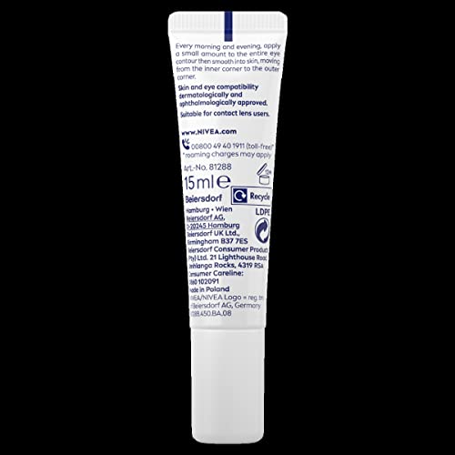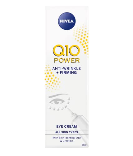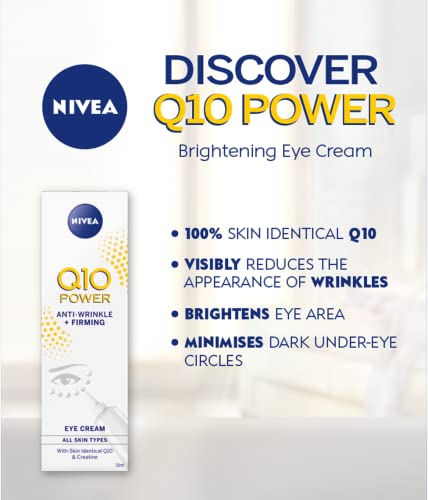Details: Product Description NIVEA Q10 Power Anti-Ageing Eye Cream - powerful wrinkle cream for the delicate under eye area. Our Q10 Power Anti-Ageing Eye Cream reduces the appearance of fine lines and wrinkles around the eyes, leaving smooth and bright looking skin. The powerful eye cream for bags under eyes combines the powerful antioxidant Q10 with Creatine. Coenzyme Q10 is an antioxidant and energiser that helps to rejuvenate your skin, protecting it from damage and slowing the ageing process. Q10 Power also contains 10x more creatine than Q10plus. Creatine helps to repair skin cells and allows the skin to regenerate leaving you with a more youthful complexion. The special formula of Q10 and Creatine helps to tone the skin, leaving it visibly firmer and younger-looking. For optimal results complement your routine with NIVEA Q10 Power Day & Night Creams. NIVEA's skincare formula with Coenzyme Q10 - for protected & beautifully smooth skin all day long. Product benefits: Anti-ageing - Eye cream anti ageing power. Q10 - Coenzyme Q10 nourishes your skin. Creatine - Contains 10x more creatine than Q10plus. Brightening and Firming - Get rid of dark circles and tone the skin. Ingredients Aqua, Glycerin, Methylpropanediol, Dicaprylyl Carbonate, Glyceryl Stearate, Cetearyl Alcohol, Hydrogenated Vegetable Oil, Tapioca Starch, C12-15 Alkyl Benzoate, Caprylic/Capric Triglyceride, Octyldodecanol, 1,2-Hexanediol, Ubiquinone, Tocopherol, Creatine, 1-Methylhydantoin-2-Imide, Potassium Cetyl Phosphate, Hydrogenated Palm Glycerides, Caprylyl Glycol, Ethylhexylglycerin, Xanthan Gum, Chondrus Crispus Extract, Trisodium EDTA, Sodium Hydroxide, Phenoxyethanol, CI 77891 Safety Warning Avoid direct contact with eyes.