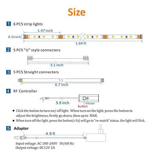 Details: Flexible and neatly connectors "U" style connector and extension connectors are flexible , 5PCS extension connectors, total length: 33.5 inch. these are convenient to connect, also keep the cabinet neatly and beautiful. Package Includes: 6 x LED light bar, 5 x straight connector, 5 X "U" style connector, 1 x CE certificated adaptor, 1 X dimmer, 1 X remote, 2 x cable holder, 8 X PINs. Tips: Before installing ,make sure the destination surface clean and dry. Specifications Volt In.: AC 100-240V Volt Out.: DC 12V, 1A Power: 2W/PC, Total 13W Lumen: 250lm/bar, 1500lm/kit Beam Angle: 120 degree CRI: >80, Colar temperature:2700K. Length of Light Strip:0.5 meter/PC, Total 3 meter.